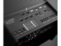 This amplifier features a black powder-coat finish and a