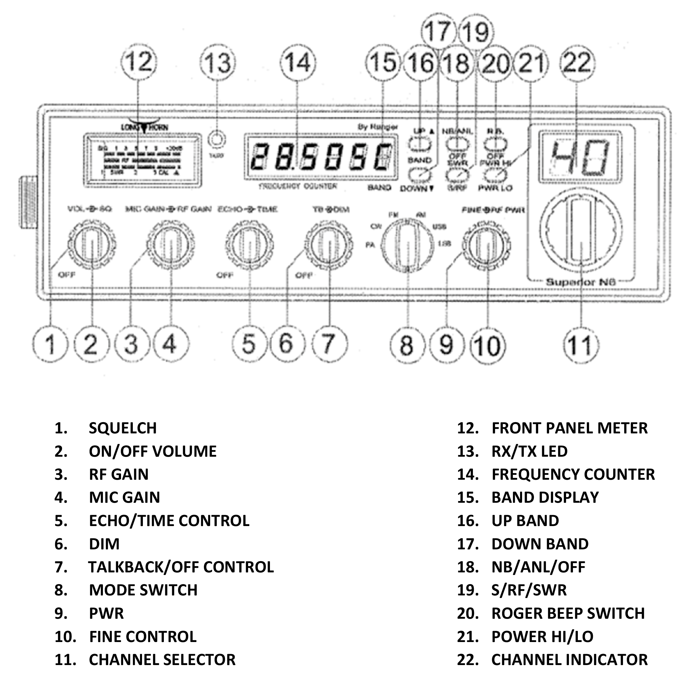 - RF Power Output: AM/CW: 20W/150W RMS; AM/SSB